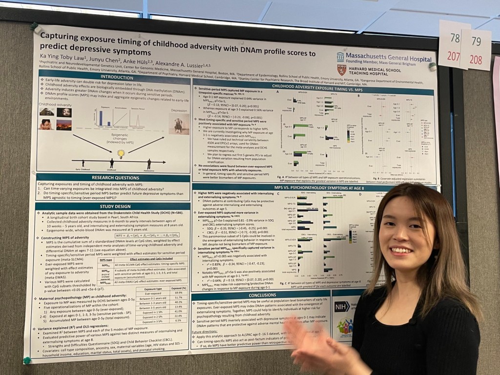 Our lab’s data analyst, Toby Law, recently shared her findings at MGH’s Celebration of Science, where she presented a poster on how DNA methylation profile scores of time-varying childhood adversity can predict depressive symptoms. We are proud of Toby’s contribution to our lab’s research and the important connections she is helping to uncover between early adversity and mental health outcomes.